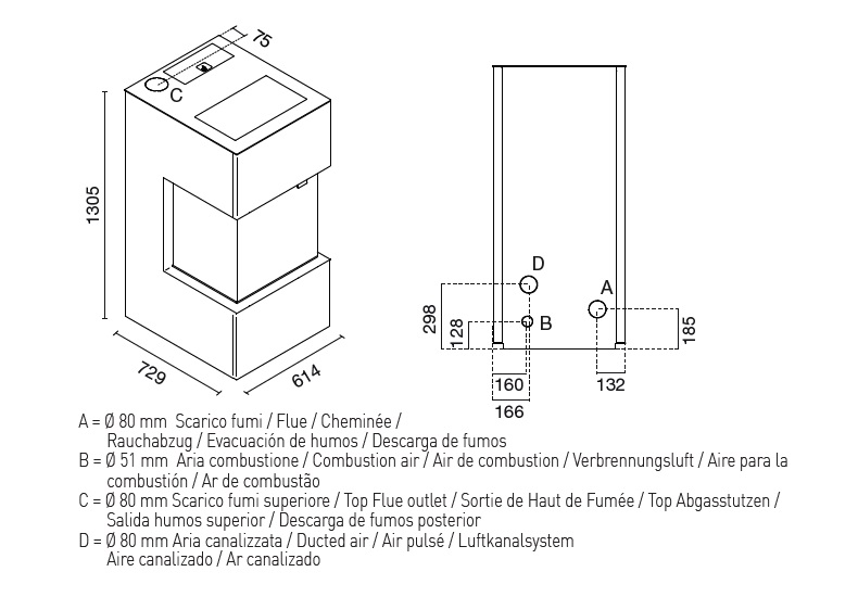 Distância mín. a paredes inflamáveis: lado: 50 cm - traseiro: 10 cm - frente: 200 cm
